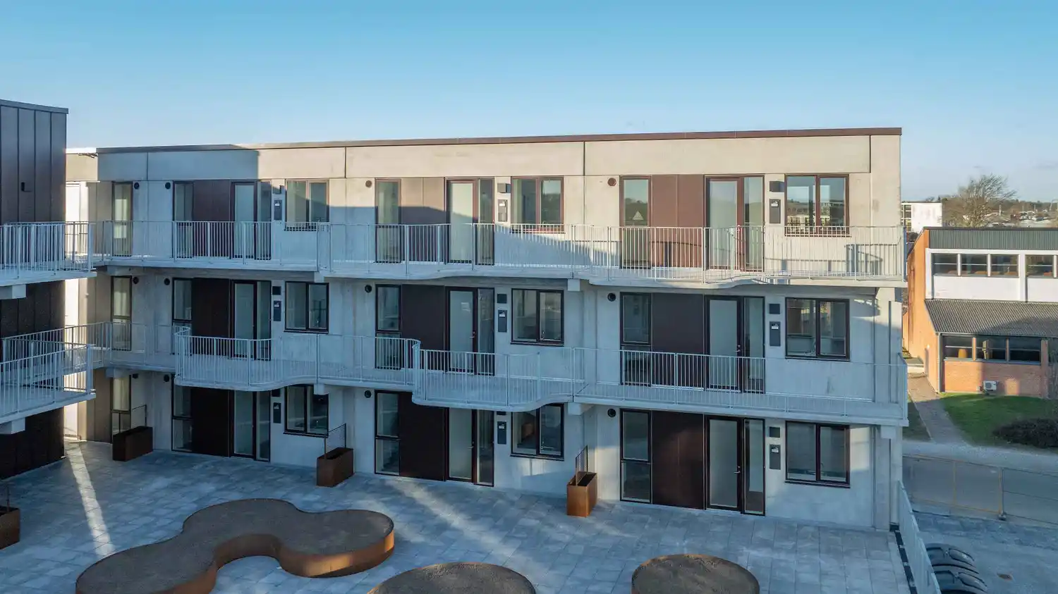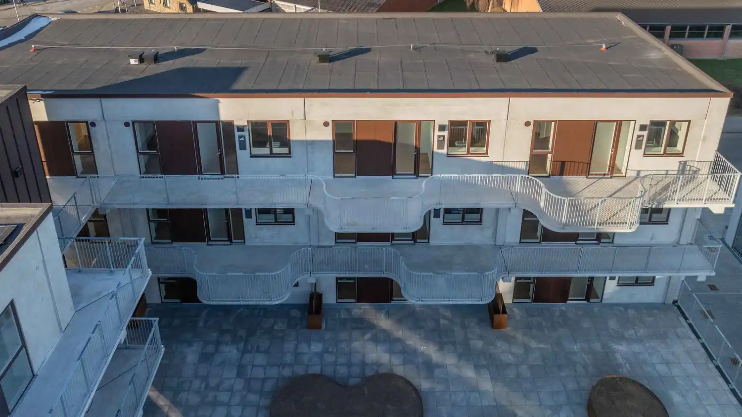 Det var derfor afgørende for projektet at finde en løsning, der kunne kombinere funktionelle adgangsforhold med et slankt facadeudtryk, samtidig med at konstruktionen skulle være robust, leve op til gældende brandkrav og sikre en driftssikker løsning på lang sigt.